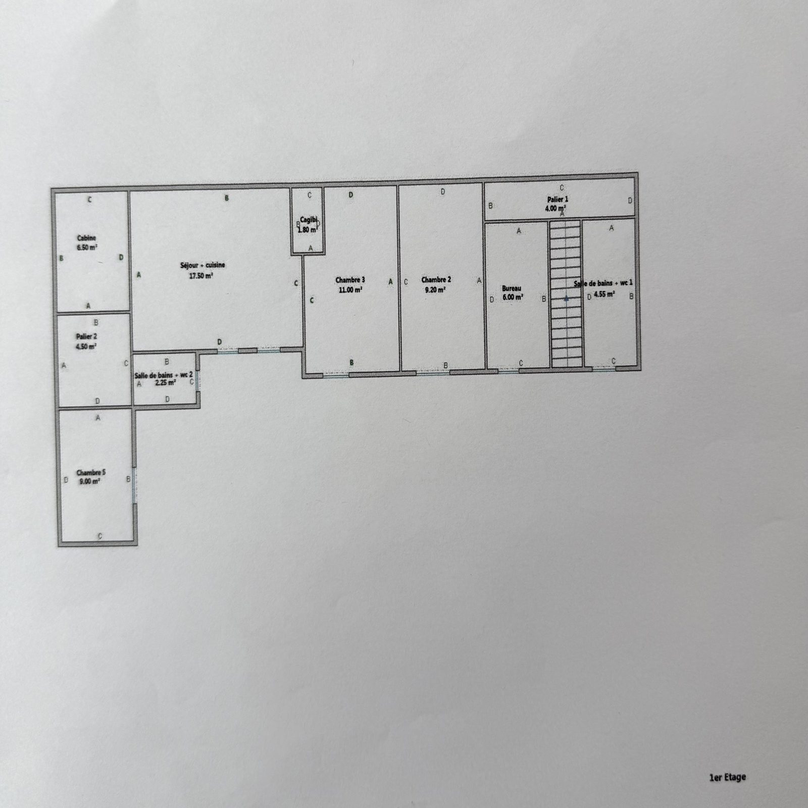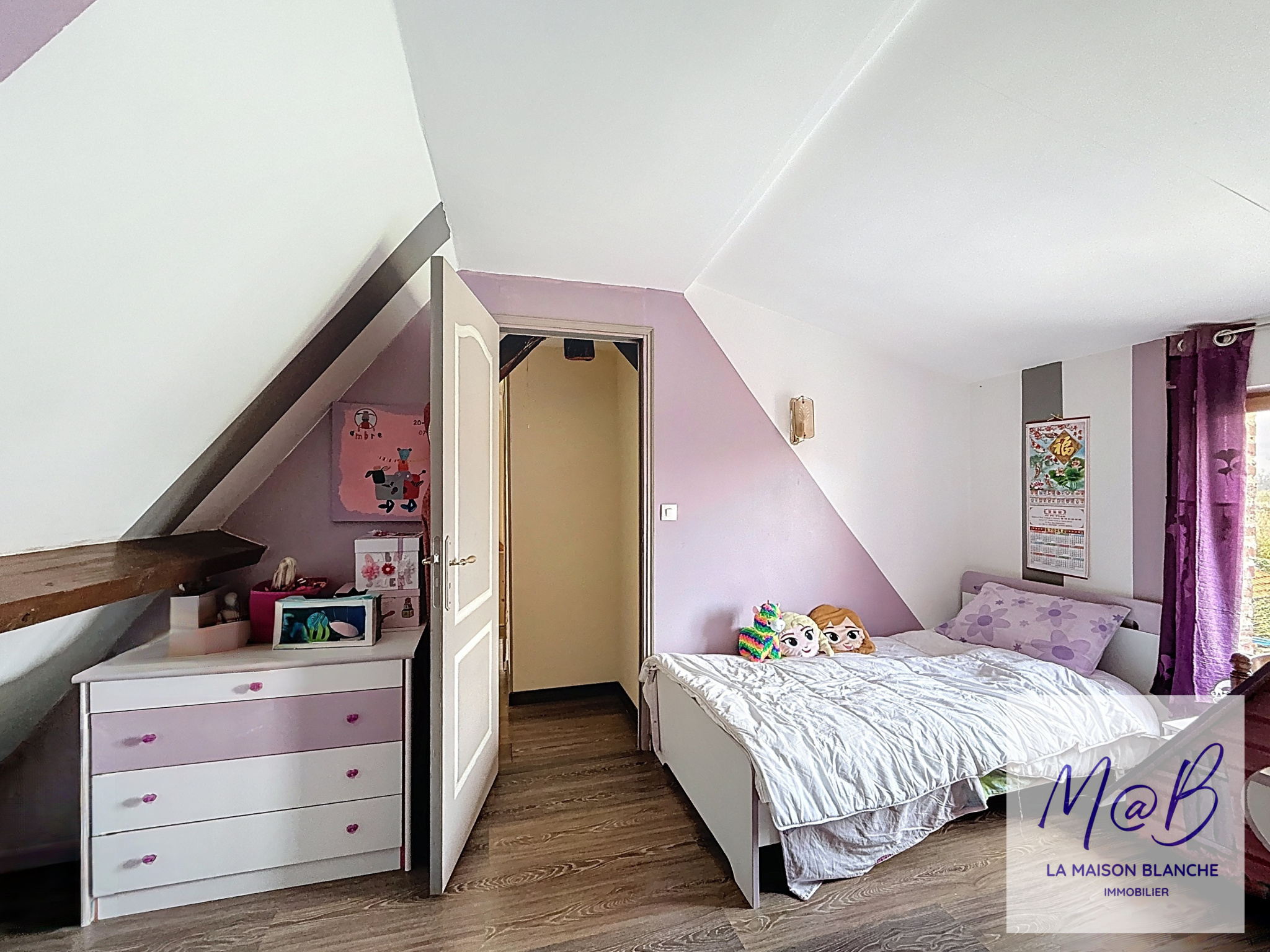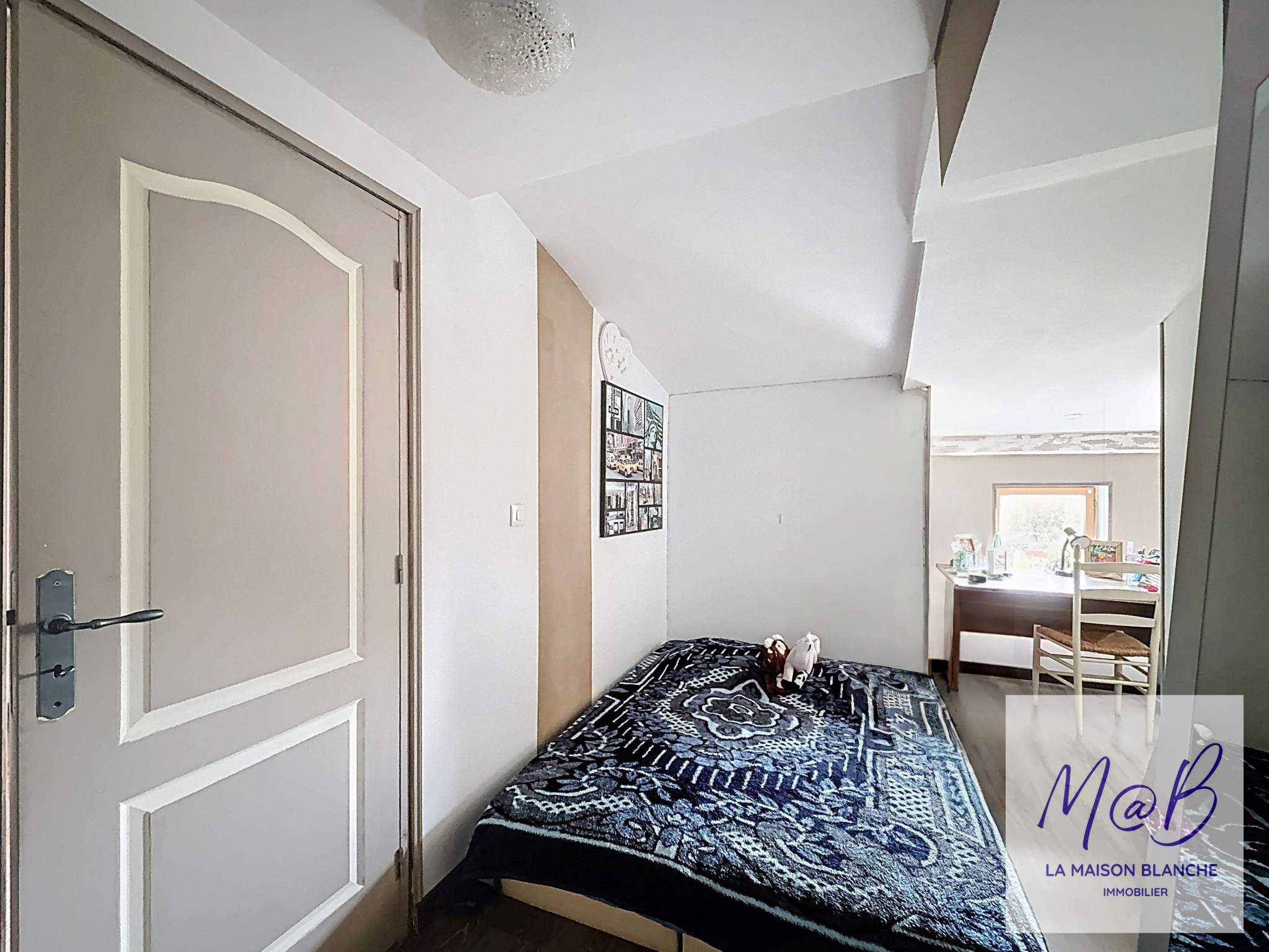 A l'étage un palier dessert un bureau, deux chambres en enfilade, une salle d'eau et un wc.